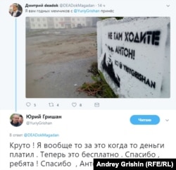 ​Еще в мае блогер Антон Афанасьев написал в своем твиттере, что в 2016 году мэрия Магадана потратила немалые деньги на благоустройство улицы Берзина, но результата он не заметил. В ответ Юрий Гришан и написал эту фразу "Не там ходишь, Антон".