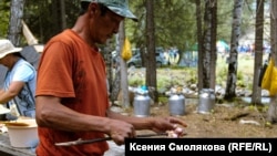 Фермер Валерий Каменев из команды Купчегеня переехал в эти места недавно. Был инспектором в Каракольском природном парке "Уч-Энмек", а потом начал разводить лошадей. Уже год он увлеченно играет в кок-бору, легко переходит с русского языка на алтайский и пользуется уважением среди местных. К Каменеву подходят люди, знакомятся и жмут руку. Он по-алтайски приветствует их, охотно отвечает на расспросы, а алтайцы на русском желают ему здоровья.
