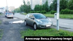 Владелец электромобиля Александр Вельц сообщил изданию "Сибирь.Реалии", что за зарядку автомобиля он платит по счетчику – к столбу проведен кабель из его квартиры на первом этаже.