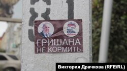 Наклейки на столбы приклеили неизвестные горожане. На них надпись "Гришана не кормить", фотография мэра и карикатура на логотип партии "Единая Россия", где вместо названия написано "Едим Россию", а вместо медведя нарисована крыса. Снимки нового "запрета" быстро распространились в социальных сетях города.