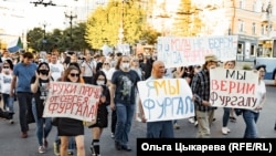 – У меня другого руководства нет. Пусть вернут нам Сергея Ивановича, пусть он продолжает работать. Я за него не голосовал, сто лет на выборы не хожу. Но сейчас я вышел за него, и буду выходить за него, – говорит Артем Демченко, он несет плакат "Я/Мы Фургал". – А Фургал как кость в горле застрял у Москвы. У него же рейтинг выше, чем у Путина. Он много работал, посрезал чиновникам зарплату, накрыл коррупционные схемы. А то, что он бизнесмен, – да все это знают. Каких-то бизнесменов он якобы убил? Да в 2004 году бандиты только были, а не бизнесмены, и я ему верю, что он не убивал никого. Про нового, Дегтярева, толком не знаю ничего. Но слышал что-то, мол, он нас дубинками будет разгонять. Ага, посмотрю я, как он будет нас разгонять. Мне кажется, ему уже чемодан обратно пора собирать.