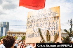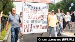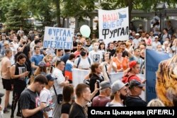 В Хабаровске сегодня около 27 градусов – довольно жарко, но колонна уверенно возвращается на площадь перед зданием правительства региона – митинговать. В общей сложности митинг на сей раз продолжался около пяти часов. Помимо лозунгов "Свободу Фургалу", "Я/Мы – Сергей Фургал", "Хабаровск своих не бросает" все чаще звучали "Путин – вор", "Чемодан – вокзал – Самара", "Дегтярев – иди в баню".